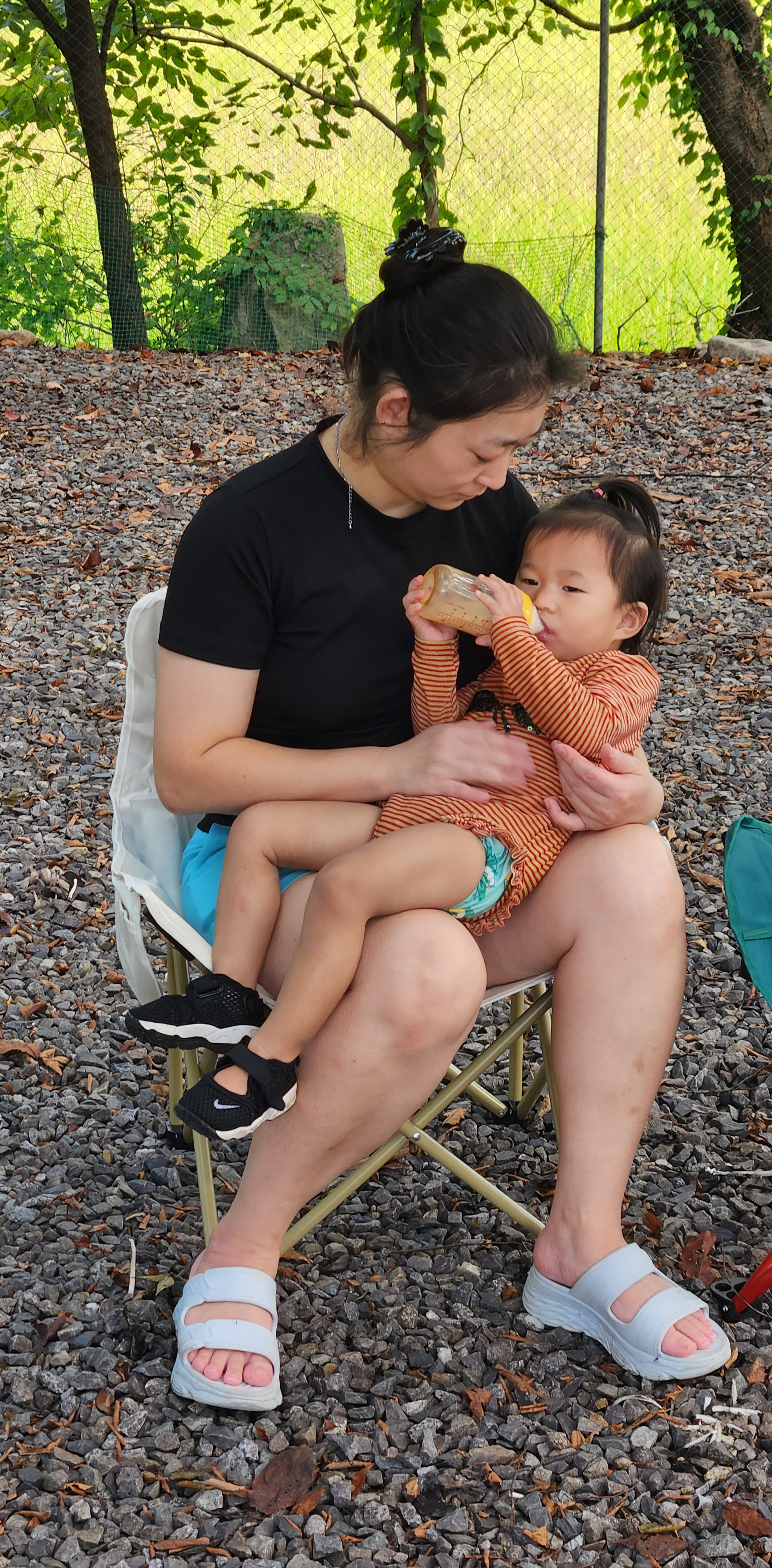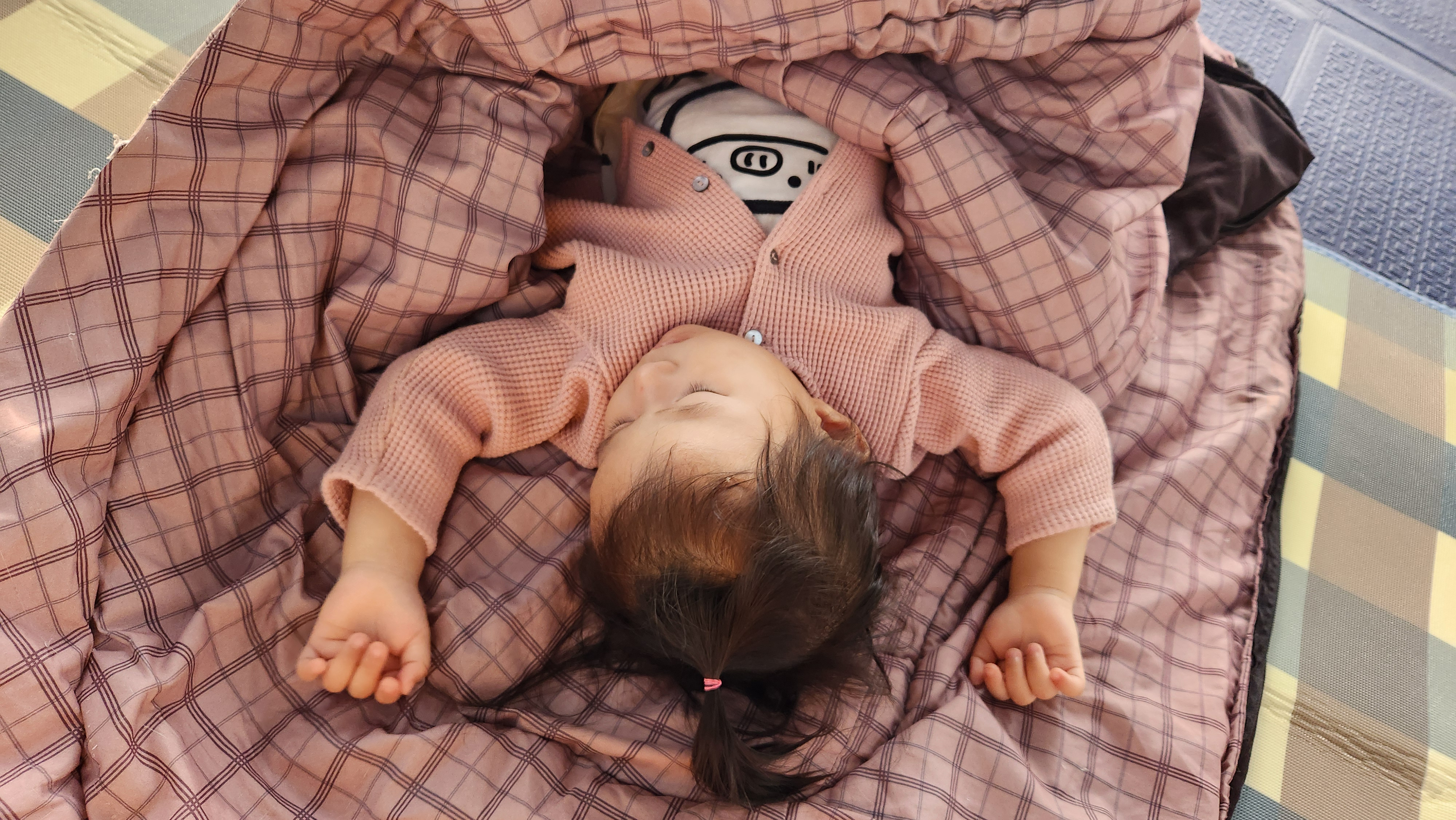 잠들어서 텐트 안에 살짝 눕혔어요