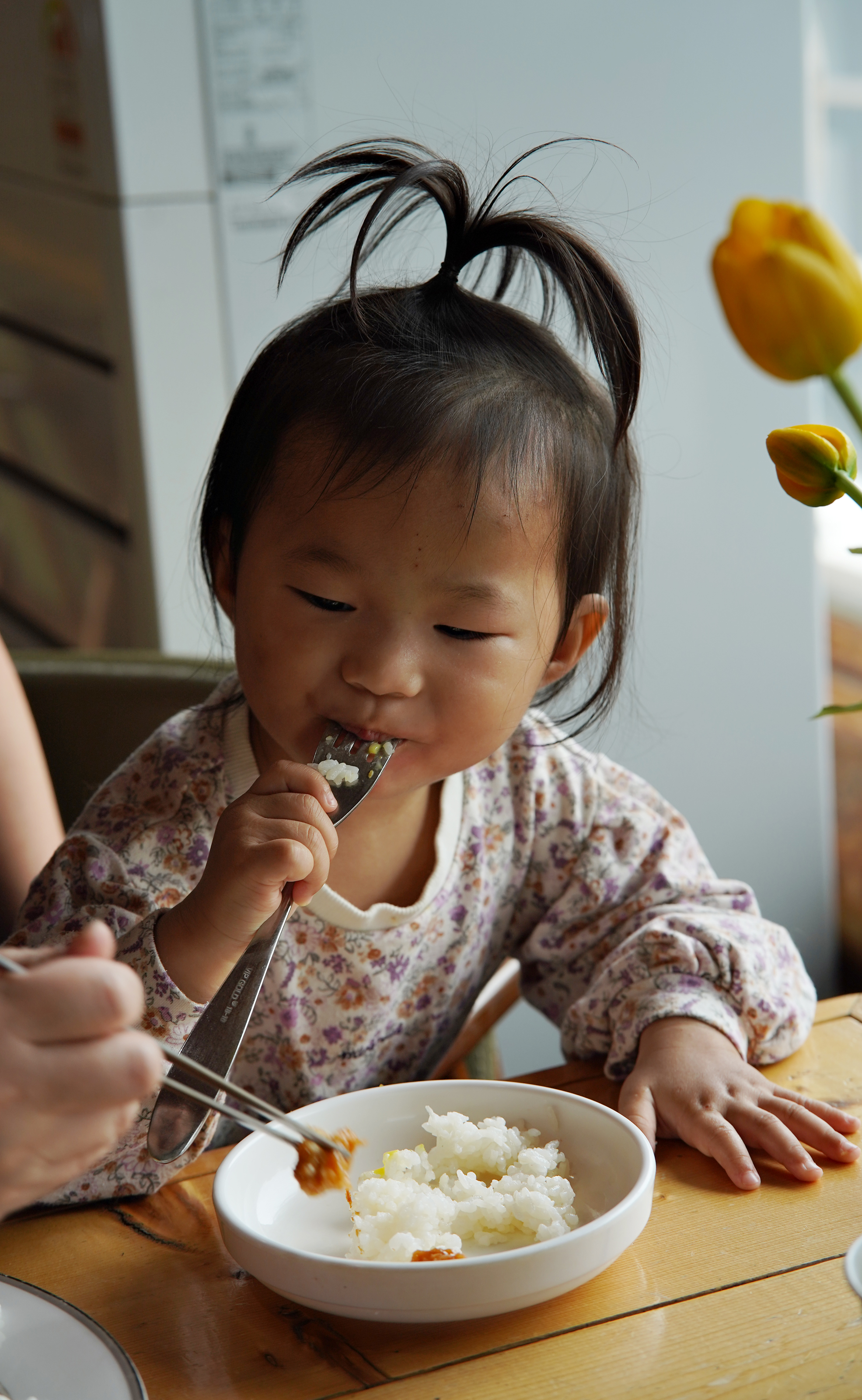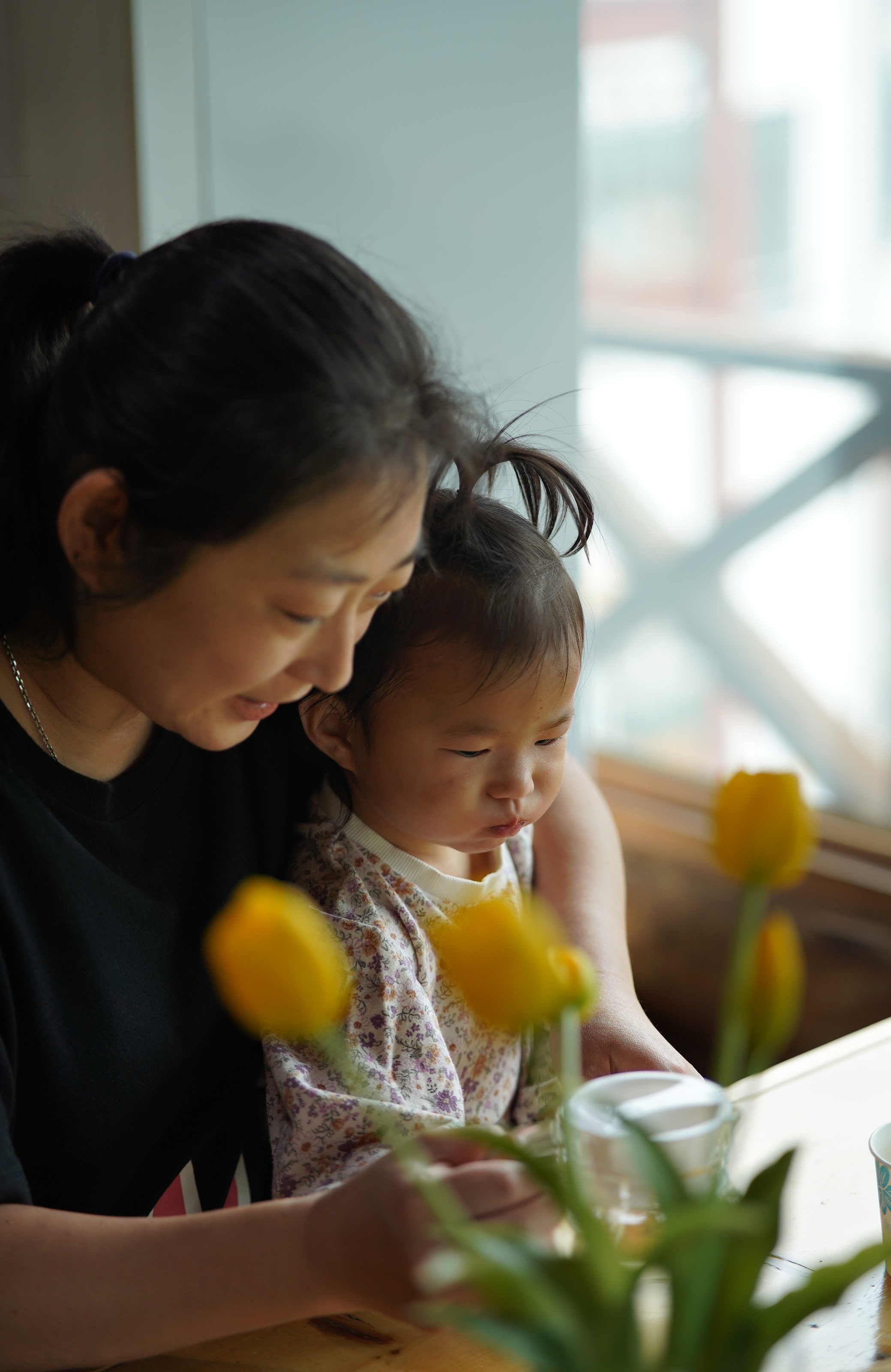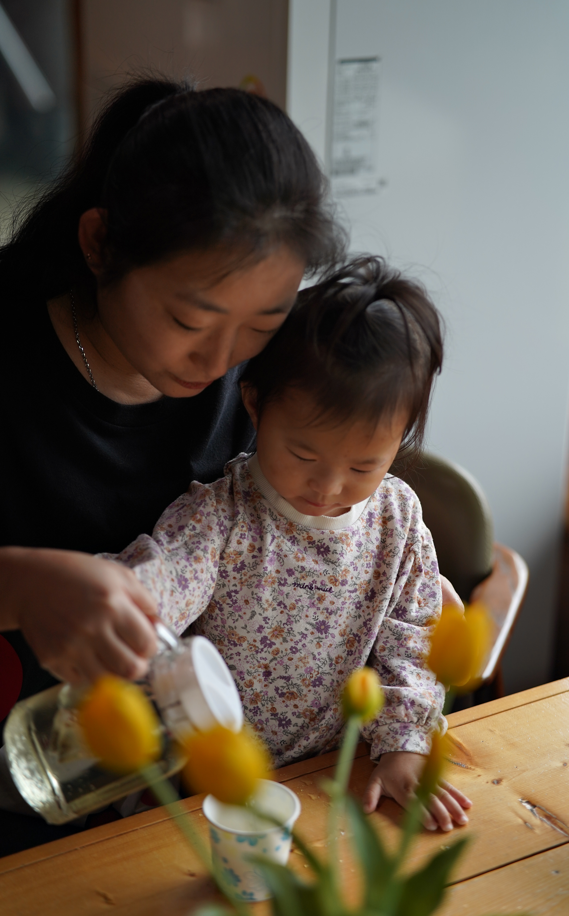 튤립을 만지는 아기