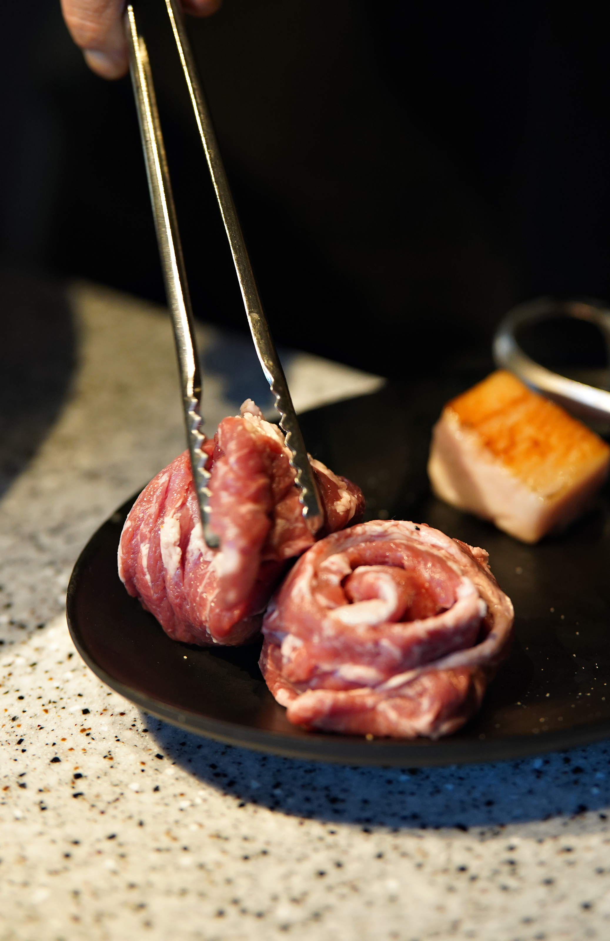 고기지방 집게로 집어서